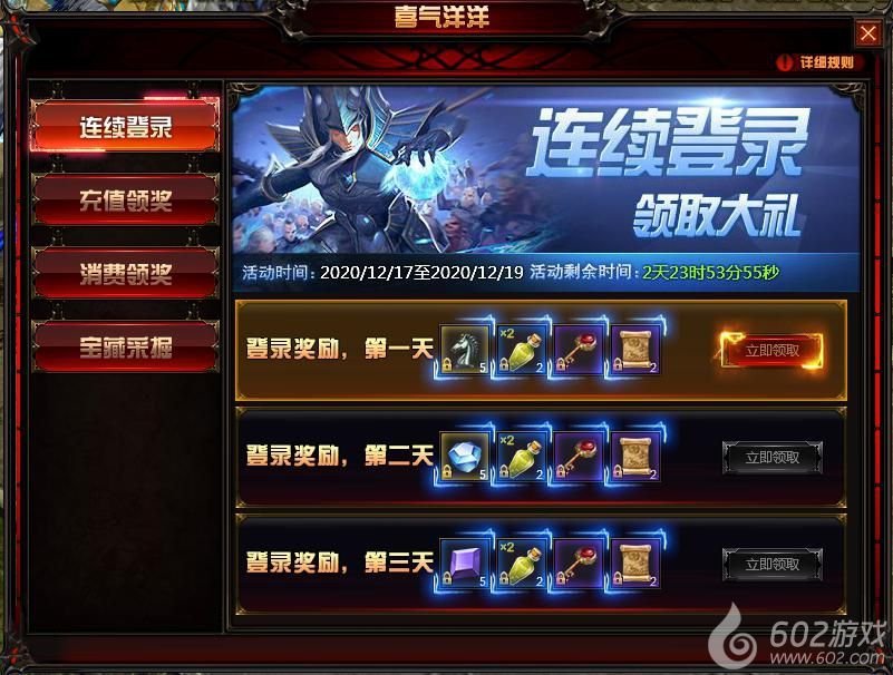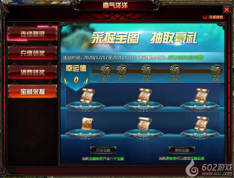 活动内容:玩家在活动时间内,可领取活动期间每日登陆可以获得1个“宝藏秘钥”,2张“更改券”。
