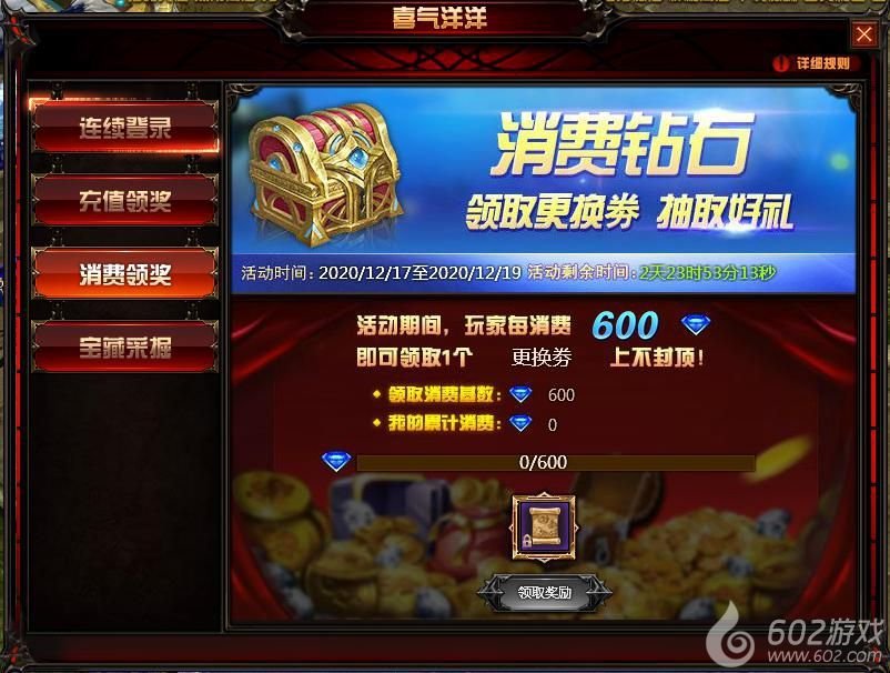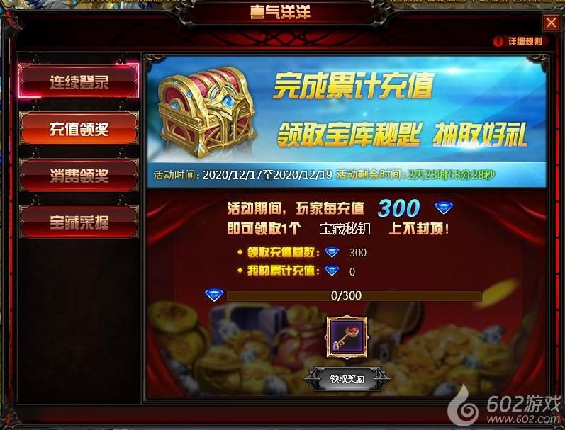每充值300钻石可获得1个“宝藏秘钥”,每消费600钻石可获得1个“更换券”。