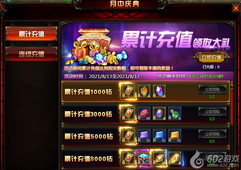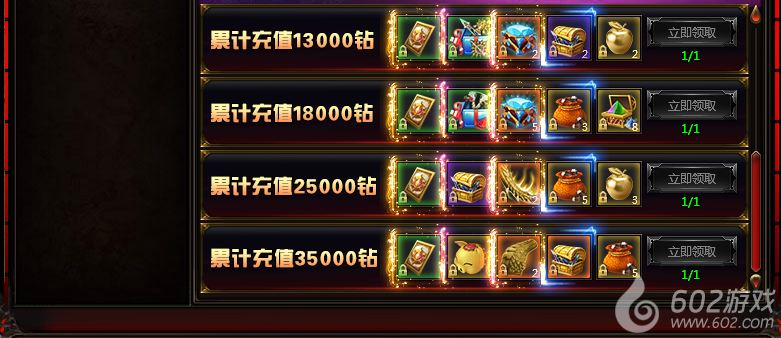 活动内容:玩家在活动时间内,累计充值达到一定钻石即可获得丰厚礼品,超值奖励等你来拿!
