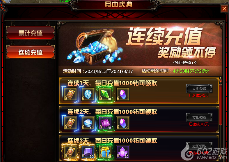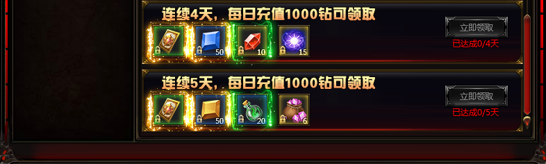 活动内容:活动时间内,玩家每日充值达到1000钻,即可获得丰厚奖励!