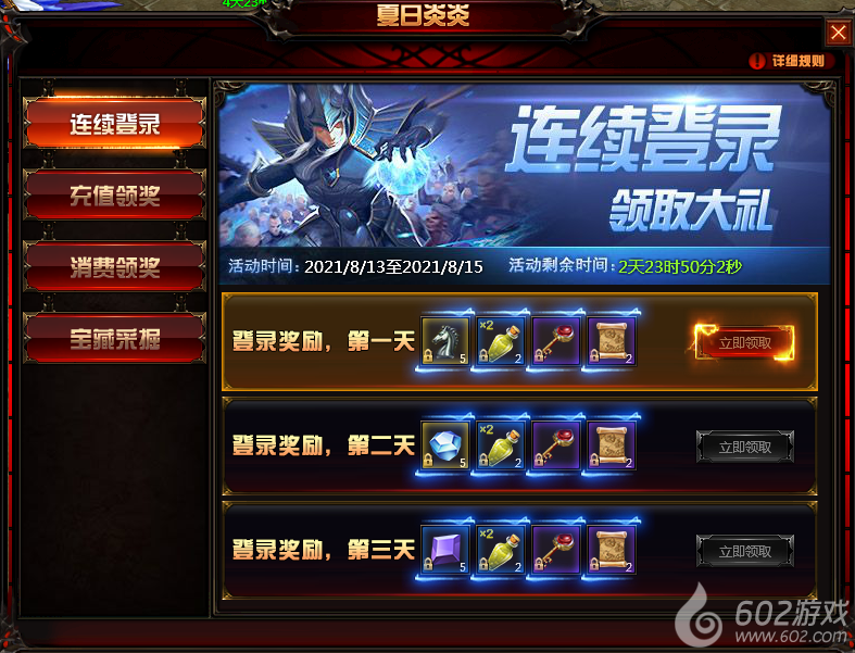 活动内容:玩家在活动时间内,可领取活动期间每日登陆可以获得1个“宝藏秘钥”,2张“更改券”。