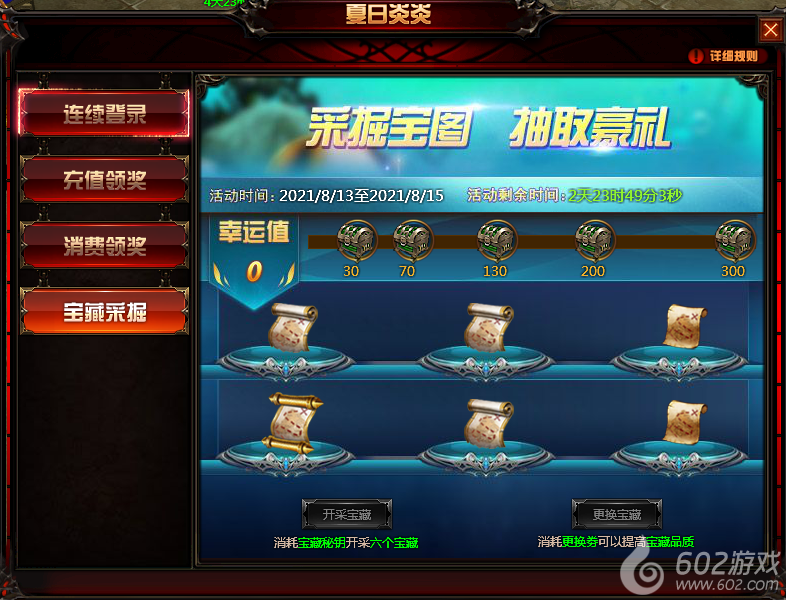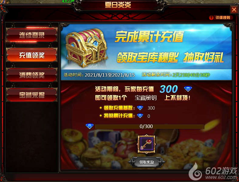 每充值300钻石可获得1个“宝藏秘钥”,每消费600钻石可获得1个“更换券”。