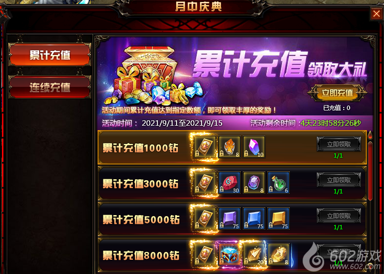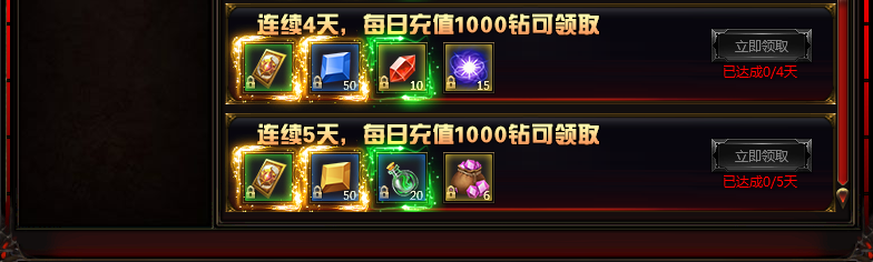 活动内容:活动时间内,玩家每日充值达到1000钻,即可获得丰厚奖励!