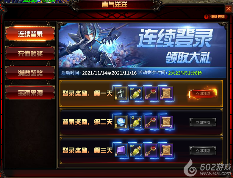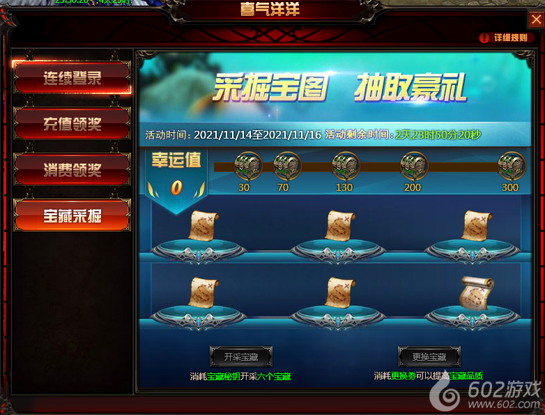 活动内容:玩家在活动时间内,可领取活动期间每日登陆可以获得1个“宝藏秘钥”,2张“更改券”。