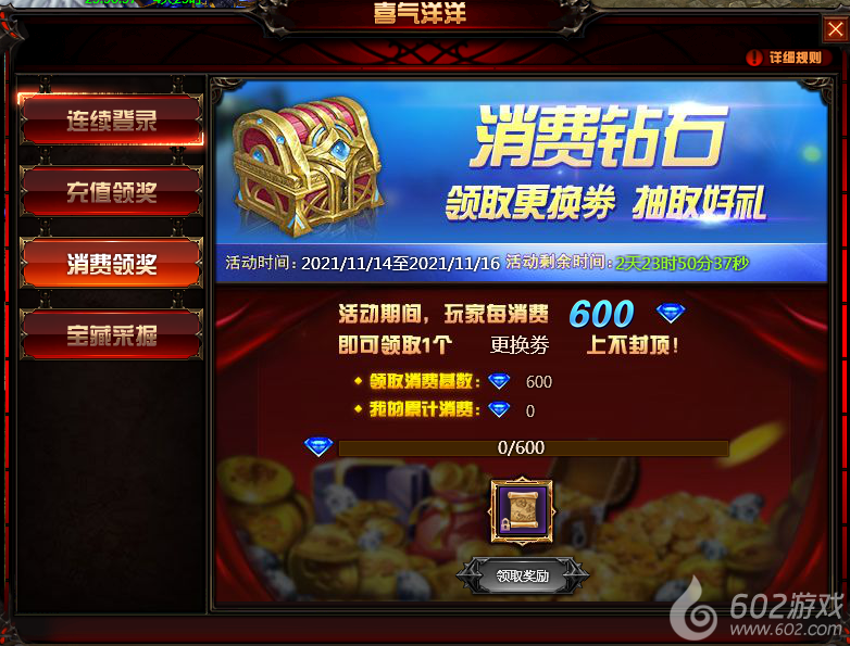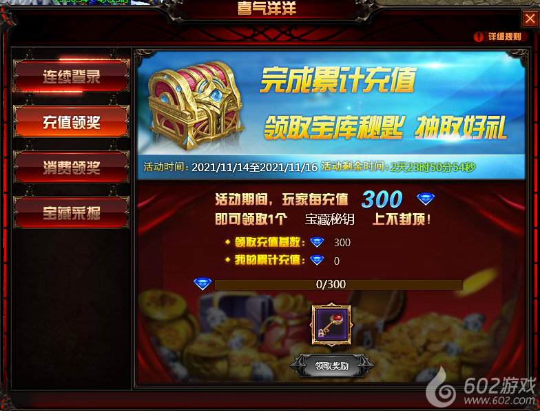 每充值300钻石可获得1个“宝藏秘钥”,每消费600钻石可获得1个“更换券”。
