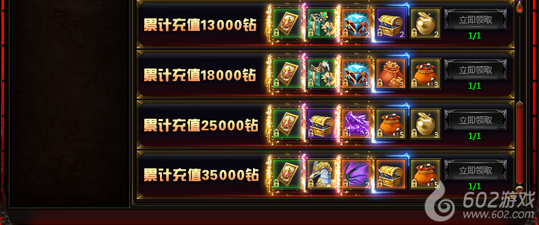 活动内容:玩家在活动时间内,累计充值达到一定钻石即可获得丰厚礼品,超值奖励等你来拿!