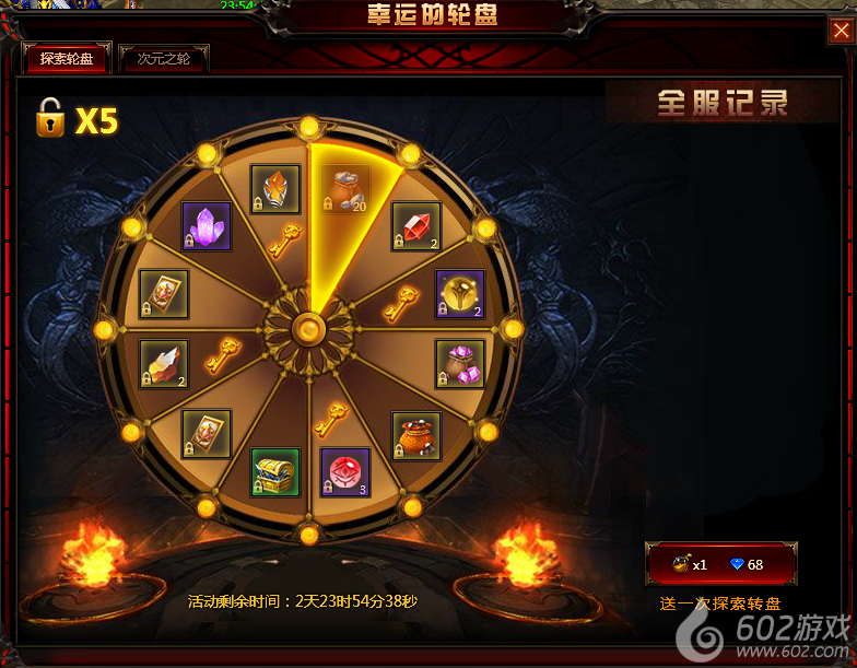 活动内容:玩家在活动时间内,使用68钻石可购买一次转盘机会,每获得5个次元要是可开启一分钟的次元之轮,次元之轮每次需要168钻石,奖励丰厚不容错过!