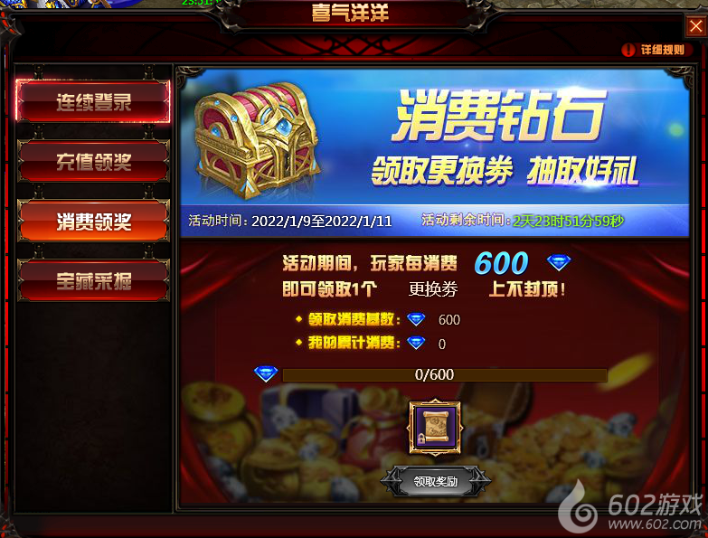 每充值300钻石可获得1个“宝藏秘钥”,每消费600钻石可获得1个“更换券”。