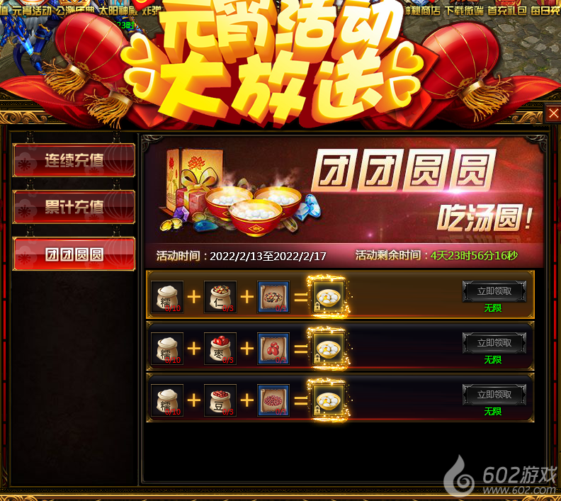 活动内容:玩家击杀小怪可获得糯米粉、果仁、红枣、红豆,击杀野外BOSS、黄金BOSS可获得五仁秘方、枣泥秘方、豆沙秘方,使用不同的食材和秘方比例可兑换不同口味的汤圆,详情请根据游戏中活动兑换页面为准。