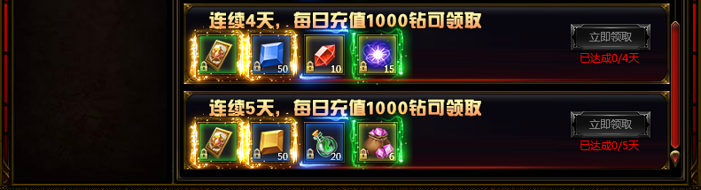 活动内容:活动时间内,玩家每日充值达到1000钻,即可获得丰厚奖励!