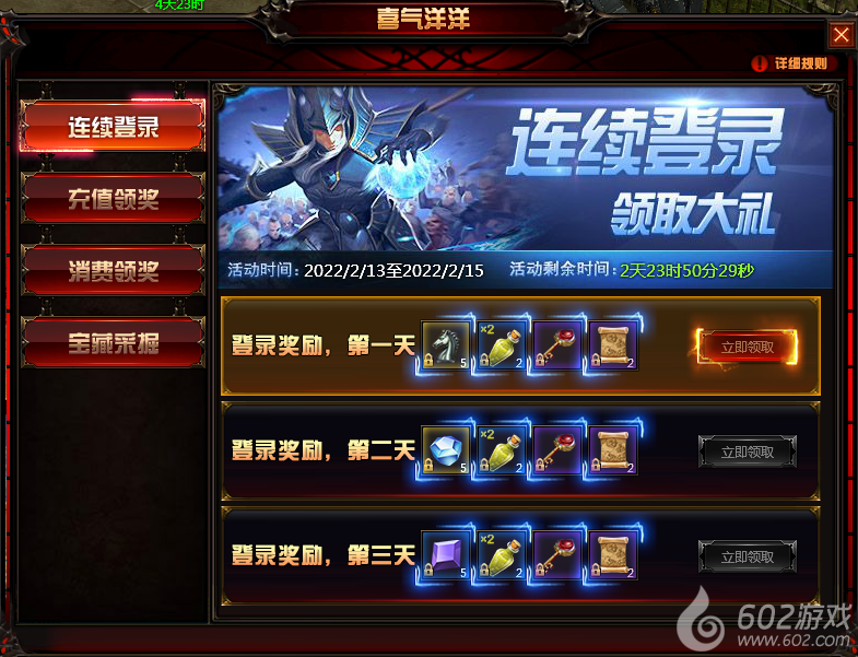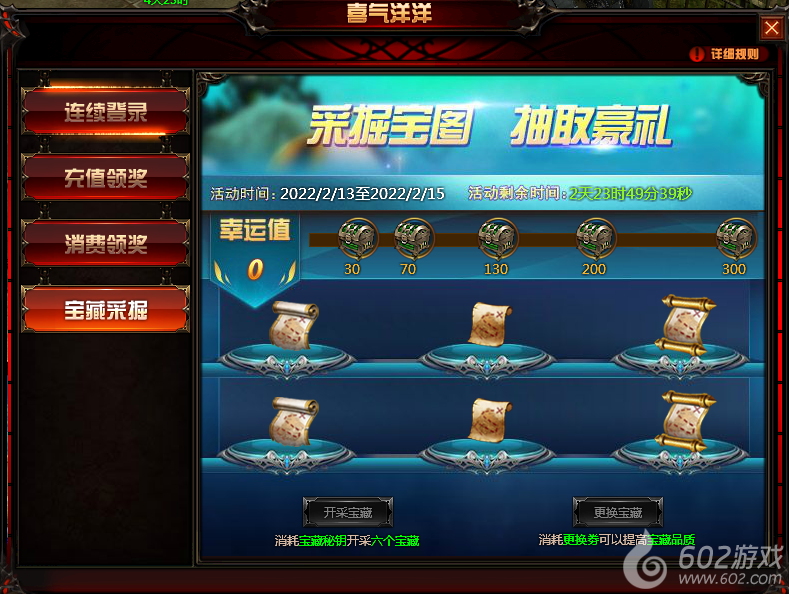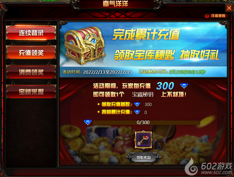 活动内容:玩家在活动时间内,可领取活动期间每日登陆可以获得1个“宝藏秘钥”,2张“更改券”。