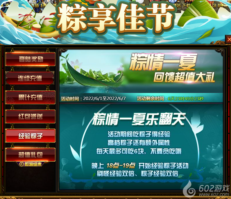 3. 粽子在每天晚上18点-19点期间食用,经验效果将翻倍。