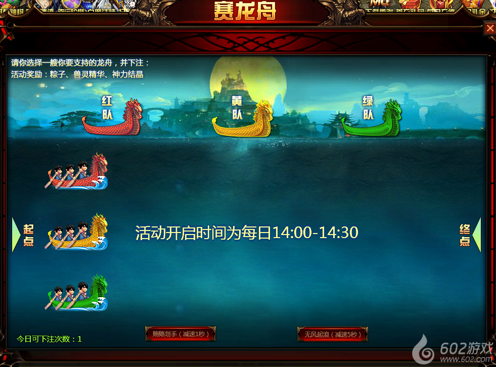 2. 活动开启的前五分钟为报名时间,届时可以选择三支队伍中你所支持的龙舟并下注。