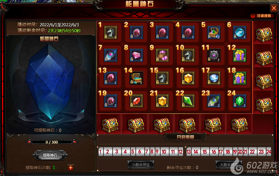 当可提取神石为0时,提取出来的神石能量按照100点能量兑换1次寻宝次数比例提取寻宝次数