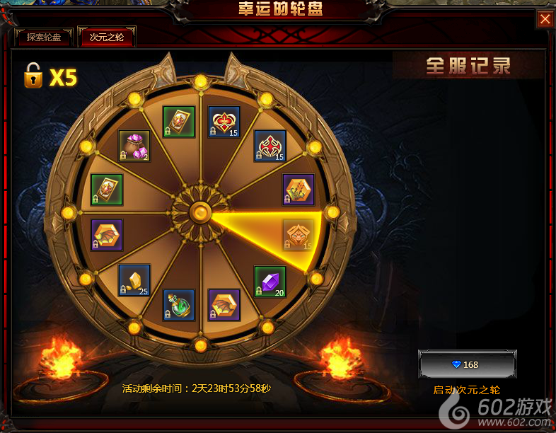 活动内容:玩家在活动时间内,使用68钻石可购买一次转盘机会,每获得5个次元要是可开启一分钟的次元之轮,次元之轮每次需要168钻石,奖励丰厚不容错过!