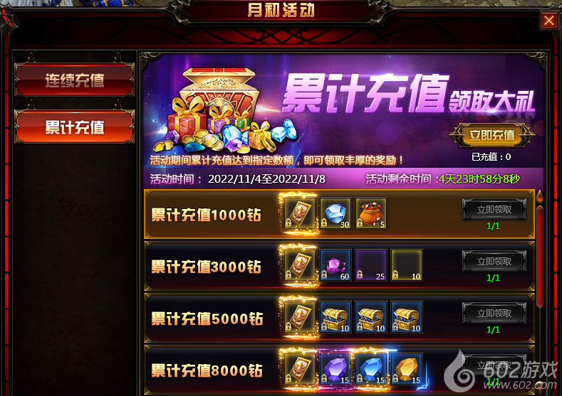 活动内容:玩家在活动时间内,累计充值达到一定钻石即可获得丰厚礼品!
