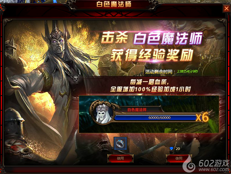 奖励3.每消减白色魔法师一层血条,全服增加100%经验加成1小时。