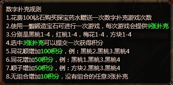 活动内容:活动时间内,玩家可以花费100钻石或1个锻造宝石购买探宝药水并获赠一次数字扑克游戏次数。